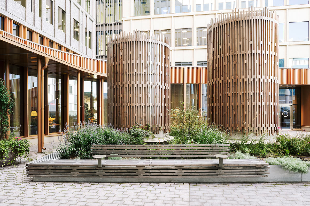 Gårdrummet er præget af frodig, grøn beplantning, der tilfører biodiversitet og sæsonvariation. Offentlige siddepladser, stier og plantekanter skaber en række af rum, hvor mennesker kan mødes og socialisere. På tagene fortsætter oplevelsen med mulighed for arbejdspladser under åben himmel, et orangeri og Origo Top Bar med panoramaudsigt over Stockholm.