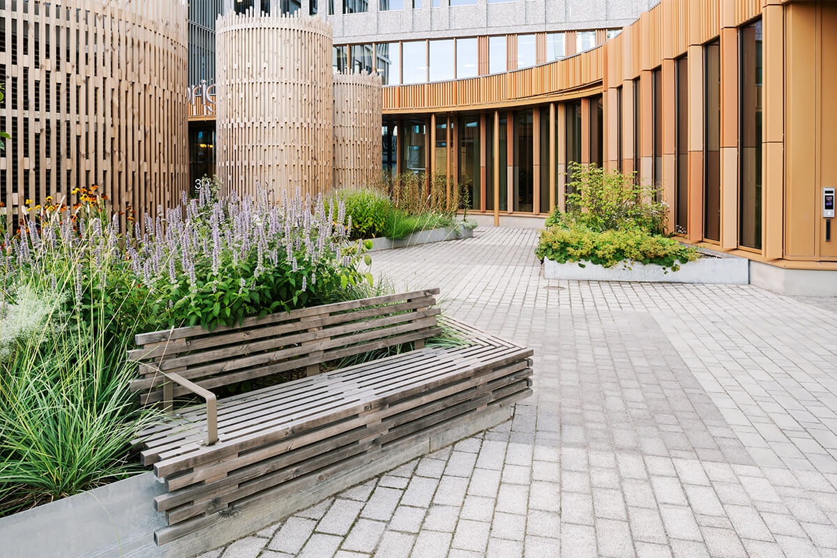 Igen bidrog Milford med sit Contrast Freestyle-system, som her danner grundlag for alle stålkanter og en række specialdesignede træbænke. Samlet set binder disse elementer udearealerne sammen med bygningens arkitektektur.