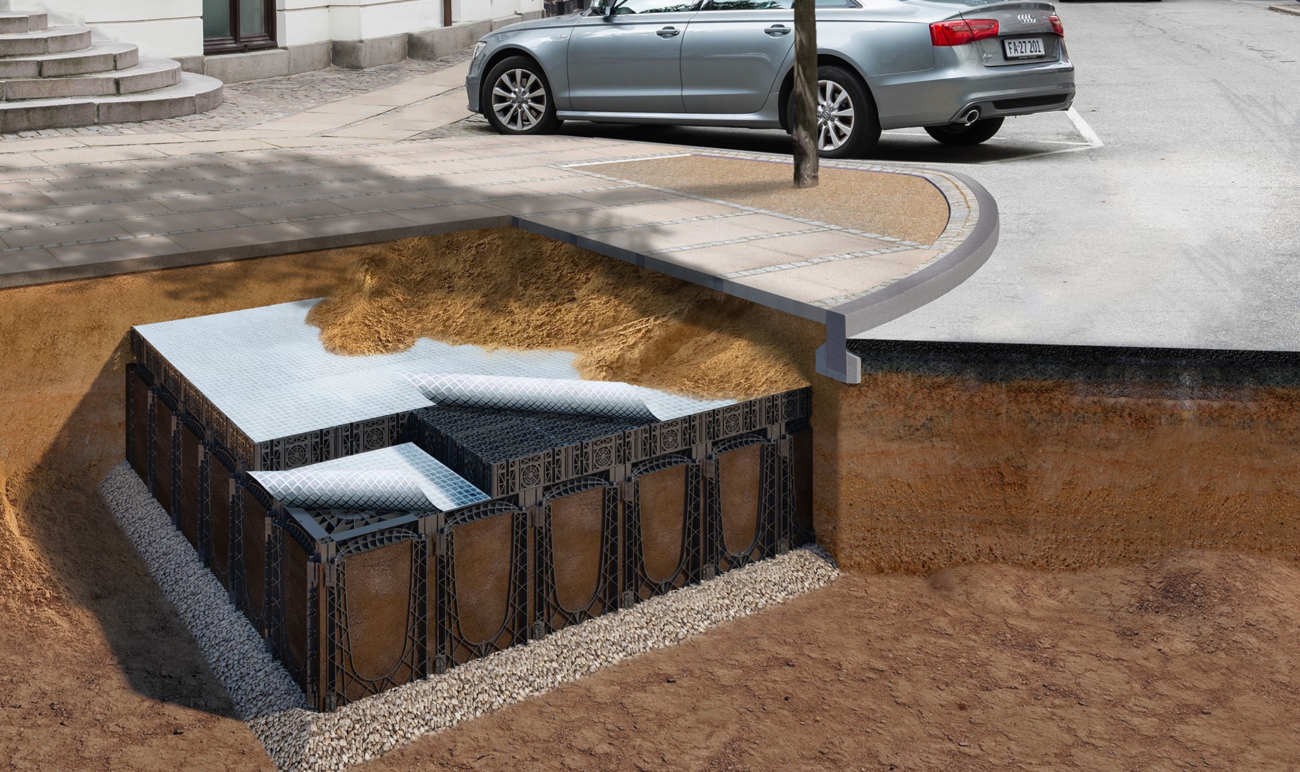 - Træplantehuller: Integrerer træer i byrummet og håndterer samtidig regnvand.